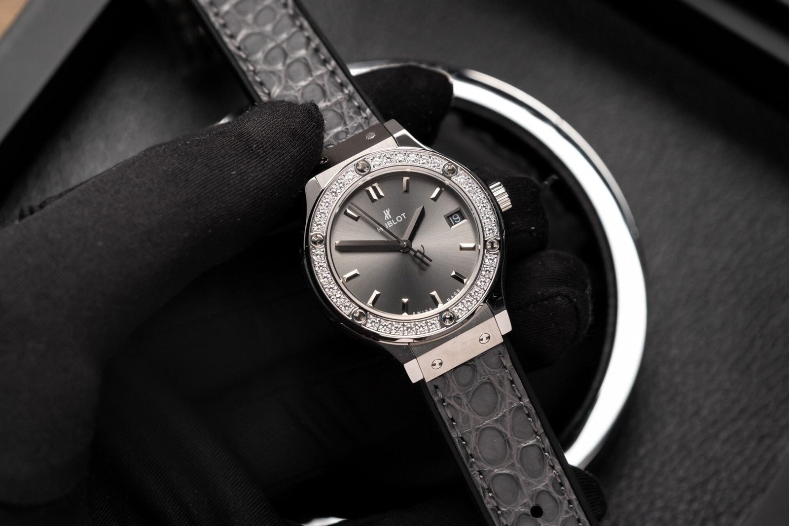 Hublot Watch With Diamonds Bezel Gray Dial 33mm